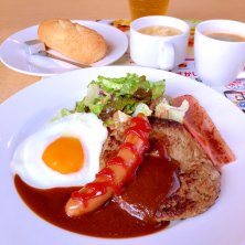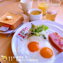おはようございます〜☁️ 今日は先輩とガストのモーニング‼️🍽 私は目玉焼き&ベーコンソーセージセット🍳🥓をいただきましたよ😊💕 自分で作るとこう上手く出来ないんですよね〜😅💦 この後会計の時ごちガストのルーレット🎰に当たって今日の会計が無料になりました💖 もっといいやつ食べれば良かったなぁ😅💦