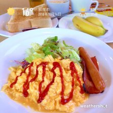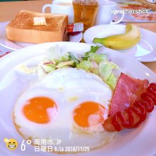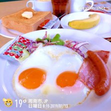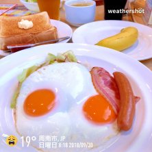 おはようございます〜☔️ 台風🌀が近づいてるというのに今週も先輩👴達とガストでモーニング☕️🍞‼️ 私は目玉焼き&ベーコンソーセージセット🍳🥓☕️🍞にバナナ🍌を付けていただきます💖