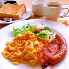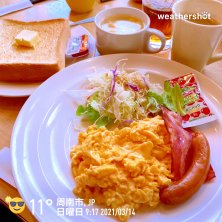 おはようございます✨ 今週も先輩達👴と恒例のガスト🍽モーニング☕️🍞 クーポン使って3人ともスクランブルエッグ&ベーコンソーセージセット😊💕 最近ずっとクーポンがこのスクランブルエッグだなぁ…😅💦