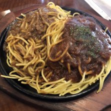 ハーフスパゲティ。 ミートソースとカレーソースのあいがけ。 鉄板で提供されるので、冷めなくて美味しい。