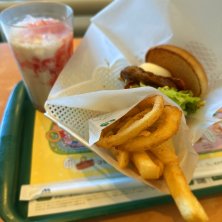 今日はモスです◎!! ロースカツバーガー、とびきりサンドのチーズ、オニオンフライ、ポテトフライ。 美味しかった♡