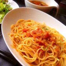 友達4人で月1回ランチの日☆ ラ・クチーナでランチBコース 前菜、サラダ、スープ パスタはベーコンとトマトのジェノベーゼ♡