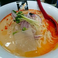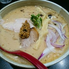 超純水採麺 天国屋@成瀬にて、タスマニア産マスタード入り味噌麺。 味噌麺の現バージョンがタイミング合わず未食のため迷わず注文。クリーミーな味噌に火を通した玉葱の甘みと生紫玉葱の辛味が混ざり合い、更に粒マスタードで酸味辛味のアクセント。ツルモチの麺もスープに負けず調和。天国屋ならではの無二の味噌。
