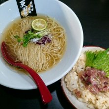 超純水採麺 天国屋@成瀬にて、限定の鮮魚第9弾 真鯵麺 赤尾鯵なめろう丼付。 一昨日の金目鯛、昨日のハタハタに続き3日連続の鮮魚麺の仕上げは天国屋さんの真鯵麺。鯵の旨みを透明感のあるすっきりしたスープに閉じ込めたかけスタイル。最初に香り、温度が下がると旨みが前面に。丼もなめろうが美味(意味深)笑。