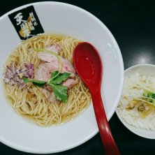 超純水採麺 天国屋@成瀬にて鶏醤油麺(淡口)。 相模原のワンコインな家系をいただいた後なので、本日限定の豚頭煮干しは残念ながら自粛。その代わり、いつも限定ばかりでなかなか機会が無いレギュラーメニューをいただきます。やっぱり鶏は旨いや😋 ホントは生醤油やウルメもいただきたいけど、平日はなかなか伺えず残麺🙍