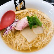 超純水採麺 天国屋@成瀬にて、太刀魚煮干し淡口白醤油麺 しめごはん付。 今週末で太刀魚煮干しは一旦休止し、在庫は後進の若い店主に回すそう。進化さんで一緒になった麺友さんと一緒に連食へ。今回は油を使わないとのことで、丼は太刀魚の香りが匂いたちスープを啜れば和出汁のように身体にしみる旨さ。佐々木店主マジック魅せていただきました♪