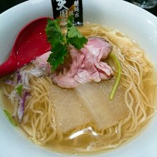 超純水採麺 天国屋@成瀬にて、熊本県産 太刀魚煮干し淡口白醤油麺(お茶漬け用ご飯付)。 待望の太刀魚煮干しがようやく入荷し、久々提供の一杯は太刀魚の上品でスッキリした甘みがいつもに増して感じられる出来。とても太刀魚と水だけで採った出汁とは思えません。チャーシュー、出汁の染みた大根をご飯に載せてスープでお茶漬け、コレもまた最高♪
