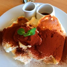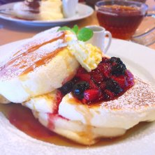 ◆食べ納め、予定◆ しゅわしゅわ、ほわほわのパンケーキ、まだまだ人気ですね♪ 私も好きなのですが、最近は気持ち的に落ち着いてきたような…気がしていたものの… 「食べたいのよね♥」 とリクエストがあれば決して拒みはしませんよ(笑) 行ったことあるお店はパスで(これ系パンケーキに限り)という私の希望だけ伝えて決まったのがこちらのお店。 *ティラミスパンケーキ メイプルとエスプレッソのshotで甘さと苦さを演出。 あ、掛ける前の写真撮っておいて良かった(経験済) しゅわ&ほわちょっと小休止♪