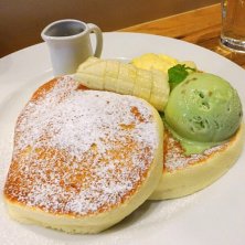 お昼に食べるつもりが、2時半になってありついたのがこれ! ◎プレインパンケーキ、ピスタチオアイス添え 1250円 スプーンで食べられるフワとろ感が、売りのパンケーキ 確かにスプーンで食べられる独特の柔らかさ~! 間違いなく美味しいです!!(*^^*) でも、パンケーキの外観してますが、別物と言うのが私見。 卵の白味をフワフワのスフレにした物を、相当使ってるのかな…?(^-^ゞ まあ、3時間、良い勉強させて貰いました~(((^_^;) 東京で暇をもて余した時に並ぶ価値は有ります