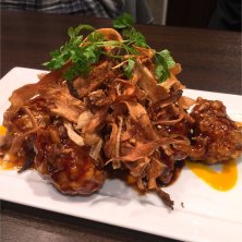 クリスピーチキンとフォアグラのフリッター フォアグラは中央のソースをつけていただきます。いろんな香辛料が入ったピリ辛のソースで、衣がサクサクで中はトロトロのフォアグラによく合ってました!