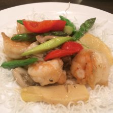 ソフトシェルシュリンプと???の甘酢炒め 蜀の香り 串に皮ごとのエビ、銀杏にトウガラシ、いろいろ(≧∇≦) ???は結局?何だったんだろう? 味は美味しかったですよ(*^^*)