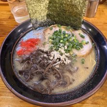 バイトの研修の後に友達と食べた 醤油豚骨ラーメン スープはとろみがあるくらい濃厚で、味的には天下一品のこってりと似ていた気がする。 そんなスープが太麺に絡み合って、分厚いチャーシューとともに食べると大満足(^^)