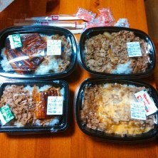 父ちゃんとホームセンター巡りをして、帰りが遅くなったので、すき家で買って来ました♪ 父ちゃん うな牛特盛り 母ちゃん うな牛並み盛り 長男 メガ牛丼 次男 メガチーズ牛丼