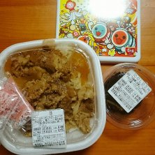 今頃、晩ごはんの投稿です。 帰りが遅くなったので、すき家で牛丼を買いました♪ 太鼓の達人のサンドウィッチケースが欲しいから、すきすきセットにしました(o´∀`o)