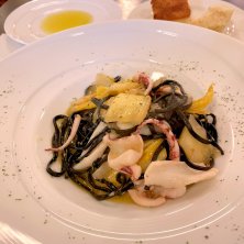 ヤリイカとオレンジ白菜のペペロンチーノ イカスミを折り込んだタリオリーニ