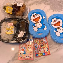 パパが帰宅後ちょっと仕事に向かったので その帰りに夜ご飯ほっともっと🍱買って来て貰った😊✨ なんにも家に食べ物ないからね…‼️笑笑 ドラえもん☆映画バージョンのパッケージになってる😍❤️🩷🧡見に行きたいな!