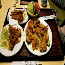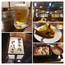 温泉の食堂でまったりと。 イカゲソピリ辛揚げ、あまり辛くはない。 鶏のきじ焼き重、甘いタレが特徴。
