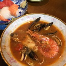 チョツピーノスープとお寿司 コストコで仕入れてきた。 魚貝類の量がスゴイ! そしてピリ辛