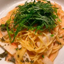明太子・長芋・大葉のパスタ🍝 時々無性に食べたくなる明太子パスタ、長芋のシャクシャクとトンブリのプチプチが良いアクセントです👍