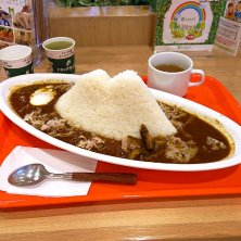 筑波山メガ盛りカレー~♪1480円 温泉卵100円 パサール守谷上りにあるステーキ屋さんへ。 お目当ては昨日に引き続きカレーです! と言っても普通のカレーで無く、茨城が誇る名峰筑波山を形どった3Dカレーwww カレーの海にそびえる真っ白な米の山は950g(笑 全体だと1.3kg位かな? 肉多めのビーフカレーは軽くスパイシーで上に茨城名産のレンコンがタップリ♪ 美味しく食べ易い味ですが、ルゥがちょっとサラッとし過ぎ。 比率が怪しかったので温玉追加したのは正解~! 普通に完食です(`・ㅂ・)و