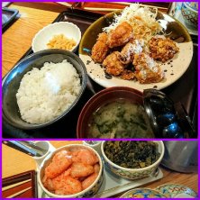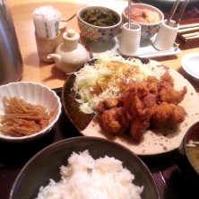 明太子と高菜…ごはんが食べ放題♪ 明太味の唐揚げ定食。 ガッツリ!