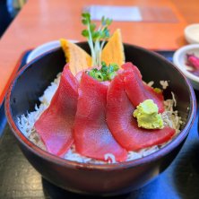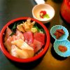 神奈川県三浦市 三崎港周辺に有る鮪を中心とした海鮮料理の店、まぐろ食堂 七兵衛丸の天然本まぐろ!海鮮丼。 特選三崎本鮪の大トロ・中トロ・赤身、生海老、旬の地魚4種、シラス、玉子焼き、胡瓜、鮪の魚卵、刺身のツマ、紫蘇、山葵が乗った海鮮丼です。また小鉢、漬物と味噌汁もセットで付く1700円のメニューです。 京急の企画乗車券である、みさきまぐろきっぷの食べる券を利用して食べました。この店で食べられるのは4種類のメニューで、1つを選んで食べます。 漁港で食べる海鮮丼はやはり新鮮で美味しかったです。