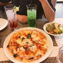 沖縄旅行二日目。 ここのピザ、ハイビスカスソーダ最高❕ 美ら海水族館に行ってから古宇利島にやって来ました。 海に入るつもりが、台風の影響か波が高いわ、雨は降るわで遊べなかった〜(´・_・`) 明日のシュノーケリングも天候不順で中止に!