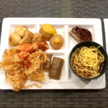 無料バイキング~♪ こんにゃくパークで朝ごはん。 無料でこんにゃく料理のバイキングが楽しめます(๑•∀•๑) 30分並んで制限時間20分のバイキングスタート! こんにゃくで出来た唐揚げ・カレー・田楽・玉こんにゃく・うどん・素麺・焼きそば・ラーメン・ナポリタンを一通り盛ってみました( ・ㅂ・)و ̑̑ 他にもレバ刺しもどきやデザートのゼリー等バリエーション豊富でちゃんとバイキングとして成立してますね♪ 中でも熱々スープを掛けて仕上げるこんにゃくラーメンが一番食べ易かったですよ(*´∀`*)