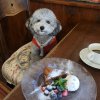 モロカイセット 3人用のセットで取り分けて頂きます。前菜感覚でアヒポキから始まり、ガーリックシュリンプはニンニク風味たっぷりでした。モチコチキンは骨まで柔らかく、調理されています。ここまででそこそこお腹は満足ですが、続いてオックステールスープです。小皿に最低スプーン3杯の刻み生姜を乗せてくださいとのことで、4杯乗せてみました。少し醤油を垂らして、テール肉にまぶして頂きました。最後はさらに追加のライスが登場し、スープと生姜でおじや風にして終了です。 娘の席は、撮影で松重豊さんが座った席でした。