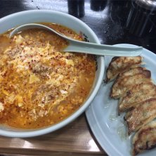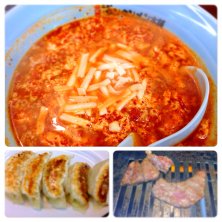 チーズニュータンタン麺!大辛 焼肉二皿と、餃子一皿。 よく食べました〜(*^^*) 麺が美味しい。 餃子も野菜の味が強めで美味しい。お肉は意外と美味しかった。 ニンニク好きはどうぞ