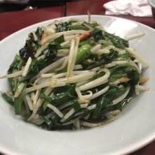 《にらもやし》は名前の通り、ほぼニラともやしの炒め物。人参とキクラゲも少々入ります。お皿ににこんもりとドーム型に盛られ、ボリュームたっぷり。 ツマミに良し、オカズに良し、麺類に入れても良し。