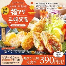 1月8日が"大戸屋"さんが 2017年1月に創業60年を迎えるにあたり "1月8日(=0108:おーとや)"を "大戸屋・定食の日"として 一般社団法人日本記念日協会にて 記念日登録した日だそうで 今年2026年で 創業68周年を迎えたとのこと その記念として〜1/13までの6日間限定で "福アゲ三昧定食"が登場 しかも またアプリで "390円(サンキュー)割"もありましたよ‼️