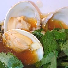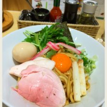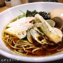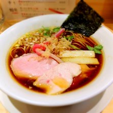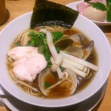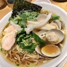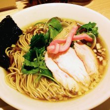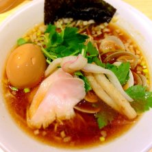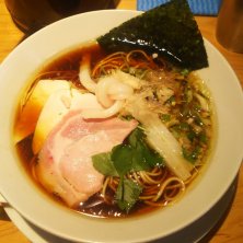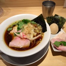 銀座、旧松坂屋裏。特製鶏SOBA1,050円。名前からして、あっさり薄味系かと思いきや、醤油の味がしっかり付いたスープ。ミツバの他、素揚げの山芋など具も変わってる。女子率高い系のお店。