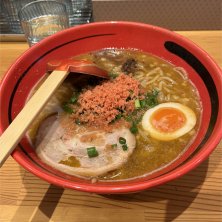 えびみそ、そのまま、太麺を注文。 スープは みそ、しょうゆ、しお × そのまま、ほどほど、あじわい の計9種類から選べる。麺も太麺と細麺が選べるので、その組み合わせは全部で18種類! チケット販売機の前でついつい迷ってしまった。 「えびみそそのまま」はまろやかにえびが香り、満足度高めでした。 連れが食べていた「えびしょうゆあじわい」はえびの香ばしさが出ていて、美味しかった。
