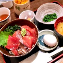 今日のおひるはヅケ丼定食(*´д`*) ホントは鰤だかも乗るハズが終わってしまったとの事で代わりに貝にw でもマグロぶつ一切れがおっきいし納豆と温泉卵と味付け海苔も付くから全部丼に乗せたらむしろゴーカにw 新鮮なので魚好きにはオススメ〜