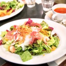 今日のおひるは軽めにサラダランチ〜(*´∀`*) …と思ったのに野菜はもちろん、エビや生ハムに温玉も乗ってて割とボリュームあるw トッピングのフライドオニオンがさくさく食感でおいしい〜 これに具だくさんのスープとおかわりOKのパンとで結局おなか膨れたよねw