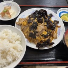 今日のランチは、豚肉とキクラゲたまご定食😁