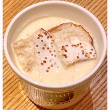 食べるスープのチェーン店、スープストックトーキョーの期間限定メニュー、フェルメールの牛乳を注ぐ女のスープ。 ゴーダチーズが溶け込んだ濃厚なミルクのスープに胡桃とレーズンのパンを入れ、仕上げに粒マスタードソースを添えたスープ。チーズの濃厚な旨味が最高。カレーとスープのセットにて注文して食べた。但し、このスープは別途100円が必要。