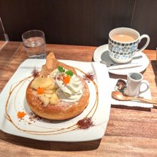 リンゴとキャラメルのホットケーキ、カフェオレ ¥2,035 パステル画教室の帰り、今日はいつも一緒の友人が体調不良でお休みだったので、1人で某カフェまで歩いたら、まさかのお休み! Googleマップには、営業中って書いてあったのにー! 周囲に飲食店が見当たらず、仕方なく電車乗って、乗換駅で下車。 いつも長蛇の列だったのに誰もいなくて、すぐ入れました。 ずっと食べてみたかった石窯焼きホットケーキ、美味しかった〜。 帰るころには、外には行列ができてました。 どうやらラッキーだったようです(^^)