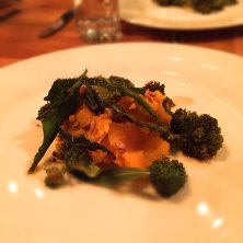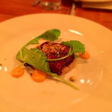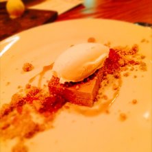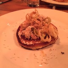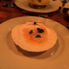 finnan haddle って、なんだそれ?w 下からパンケーキ、スモークしたなんか魚w、リーキ(ネギ)の揚げたやつ。 ワインは強めのシャルドネだったんだが、日本人的には、これにかつお節ぶっかけて醤油かポン酢、合わせるのは日本酒にして欲しかった一品。