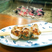 お団子型の五平餅 真ん中はよもぎで自家製味噌を付けて。