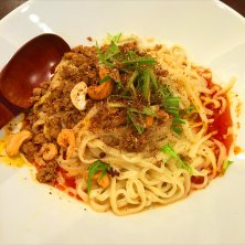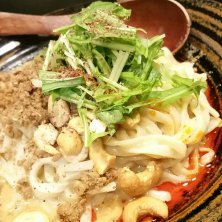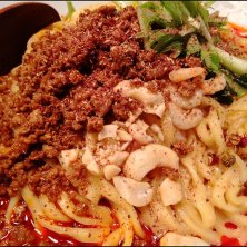 汁なし担々麺。 四川花椒少なめにしてもらったのに、舌が痺れて水までしょっぱい、、、