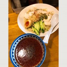冷やし海老トマトつけ麺 トマトスープは海老フレーバーたっぷり🦞 キンキンに冷えてる*\(^o^)/* バジルソースの鶏チャーシューも美味しい 麺の冷え加減は申し分ないがつけ汁の味が濃い目なのでもう少し太い麺がベターかな? ともあれ中々の冷やしつけ麺でした‼️