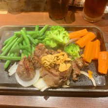 今夜は友人といきなりステーキ。友人はいきなりステーキでの食べ方知らなかったので全部いろいろと教えてあげる😊 まずは基本のリブロースステーキ300gを勧めました🤗 僕はヒレステーキ200gを。付け合わせの野菜をトッピングしまくるのでステーキが小さく見えるよw