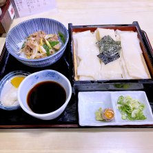 また、名古屋に出張❣ 桜山の「芳の屋」で、ざるきしめんと牛丼♡ 桜山と御器所の中間ぐらいの環状線沿いの、なかなか年季がはいったうどん屋さん❣ 老夫婦が営むレトロな店内で、昔ながらの素朴な手打ちきしめんだが、モチモチ食感の幅広、長いきしめんが美味しい 名古屋に20年近く住んでたけど、行ったことなかった