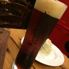 西天満「サルベーコン」にて。 『クロンバッハダーク650円』。 4月頭に開栓したばかりの樽生黒ビール! ビールの種類によって、ちゃんとグラスの形も変える所が良いね♪