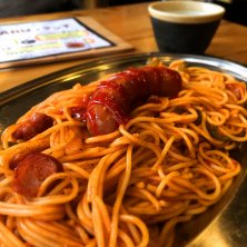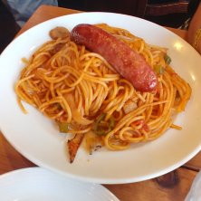 連投失礼します 食べごたえのあるソーセージが乗ったナポリタン 子供達が満足げにモリモリ食べた日本での食事1食目