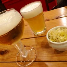 西天満「サルベーコン」にて、『ヒューガルデンホワイト590円』と『レーベンブロイ480円』。 自家製燻製とドイツビールの店。 写真右のザワークラウトはお代わり無料!!