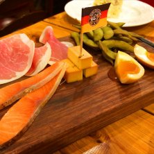 西天満「サルベーコン」にて、燻製盛り580円」。 生ハム•スモークサーモン•スモークチーズ•スモークゆで卵•スモーク枝豆。 ビールが進む♪