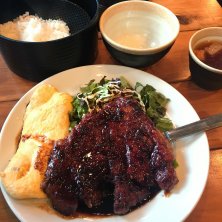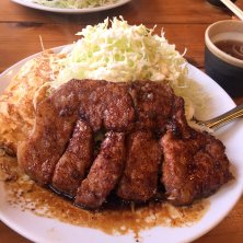 トンテキ! 付け合わせ、オムレツのようでいて出し巻きなのですがこれがサッパリして美味いのだけど、ウスターソースベースというトンテキのソースは濃すぎてなかなかヘビー。 肉自体も筋が多く切りにくく、ソースを 飛び散らかして、ズボンがシミだらけ(>人<;)